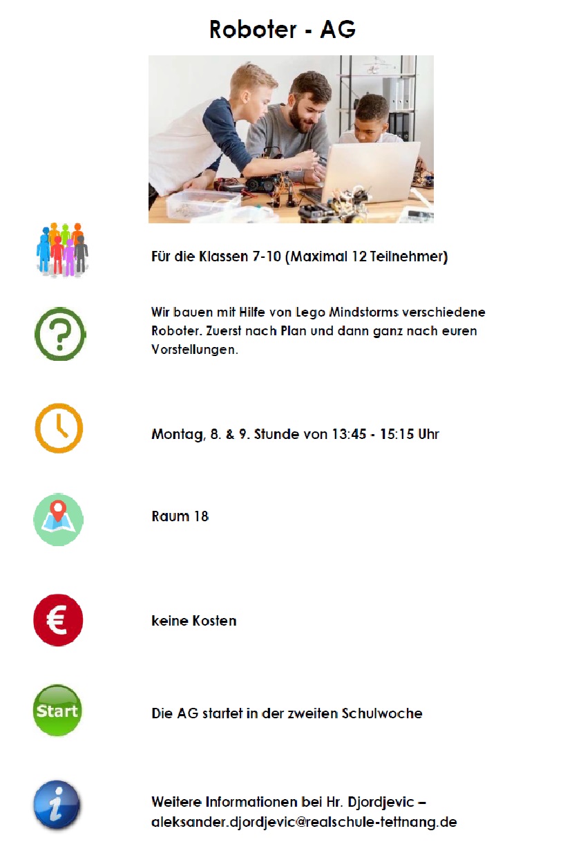 Die Roboter AG der Realschule Tettnang besteht momentan aus 12 Teilnehmern und trifft sich jeden Dienstag, nachmittags von 13.45 Uhr bis 15.15 Uhr. Die Teilnehmer sind in vier Gruppen aufgeteilt in denen jeweils ein Schüler, der mindestens 3 Jahre in der Roboter AG dabei ist, als Teamleiter eingesetzt ist.