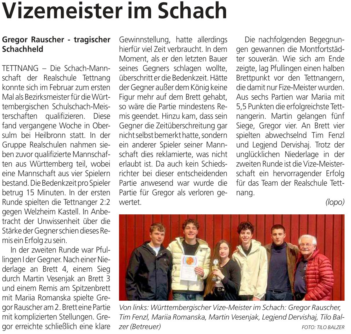 ...für Realschulen in Heilbronn mit Mariia, Gregor, Martin, Tim und Legjend hinter der Pfullingen I. Im entscheidenden Spiel gegen Pfullingen I (1,5 : 2,5) verlor Gregor in Gewinnstellung leider und unglücklich nach Zeit (15 Minuten Partien), sonst ... Trotzdem ist diese Vize-Meisterschaft ein phantastisches Ergebnis, womit keiner gerechnet hatte! Tolle Leistung von allen!